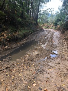 We find ourselves sloshing through mud and over rocks and gnarled tree roots.  Navigating puddles and trenches takes total concentration and we are laser focused for what seems like hours. I’m not sure what’s more slippery; the ascents or the descents. The rain seems to be enjoying the game it’s playing with us. Every time we get too warm and take off our rain jackets, it starts up again.