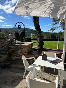 It’s a beautiful day and the woodland path is gravel, a nice change of pace for our feet. We walked along forest paths and tree-lined lanes until we came to a beautiful spot. With a lovely outdoor patio, soft music playing, and outstanding views, it seemed this contemporary restaurant, Mercadoiro, was waiting for us to stop there for lunch. It’s no surprise that we vote their Caldo Gallego the best we’ve enjoyed on the Camino, to date.